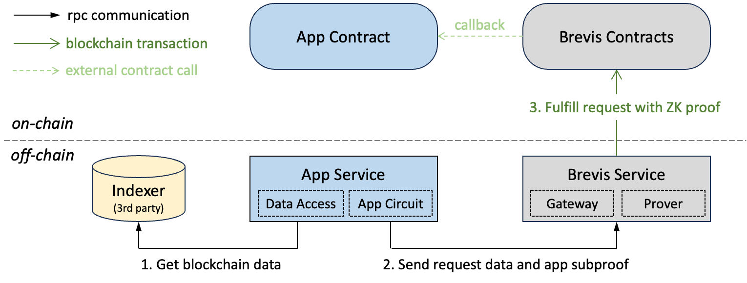 Note that Brevis is not an off-chain data indexing and query platform. Instead, Brevis’s purpose is to generate ZK proofs to convince the application smart contracts that 1) the raw data obtained from off-chain indexing solutions do exist in the history of the blockchain and 2) the corresponding computation results on top of this data is correct.